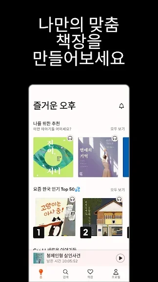 - 인기 오디오북, 최근 재생 오디오북, 찜한 오디오북을 이용해보세요.