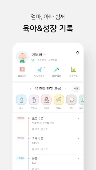 출생 후 수유, 수면, 배변 등을 기록해서 잘 키우고 있는지, 키와 몸무게 등을 기록해서 잘 크고 있는지 확인할 수 있어요.
