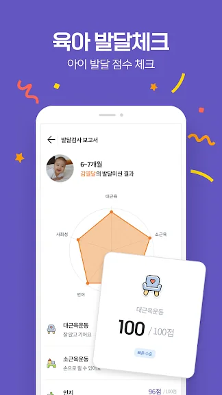 1) 매월 커가는 아이의 발달을 미션으로 체크하고 자동으로 생성되는 발달보고서를 확인해요.