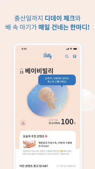 매일 쑥쑥 성장하는 배 속 아기 모습 궁금하시죠? 시기별로 성장하는 빌리의 귀여운 일러스트로 매일 확인해 봐요!