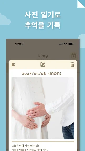 앱에 컨디션이나 검진 결과를 기록하면서 초음파 사진이나 체중 기록 등을 정리하여 관리할 수 있습니다. 그리고 만삭 사진이나 임신 기간 중의 추억을 부부가 함께 사진 일기로 기록할 수 있습니다.