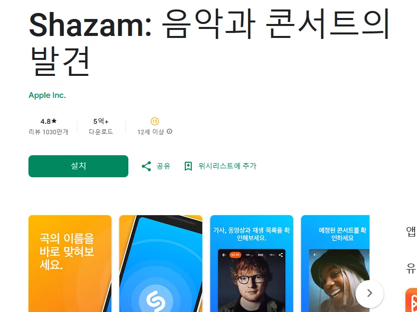 이 어플은 구글플레이스토어에서 "음악 검색"로 검색했을때 1번째로 나오는 어플입니다. 아래는 Shazam: 음악과 콘서트의 발견 어플에 대한 자세한 설명이니 참고하세요.