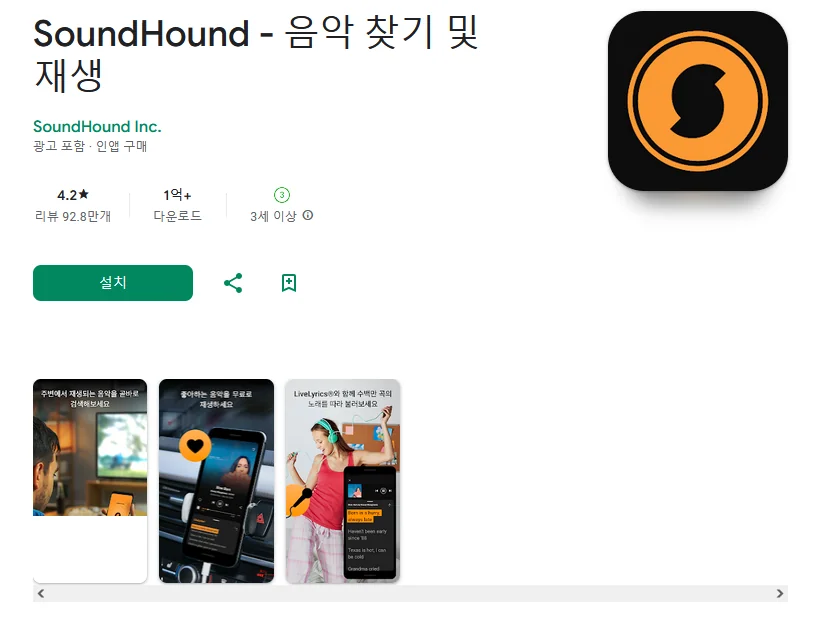 이 어플은 구글플레이스토어에서 "음악 검색"로 검색했을때 2번째로 나오는 어플입니다. 아래는 SoundHound - 음악 찾기 및 재생 어플에 대한 자세한 설명이니 참고하세요.