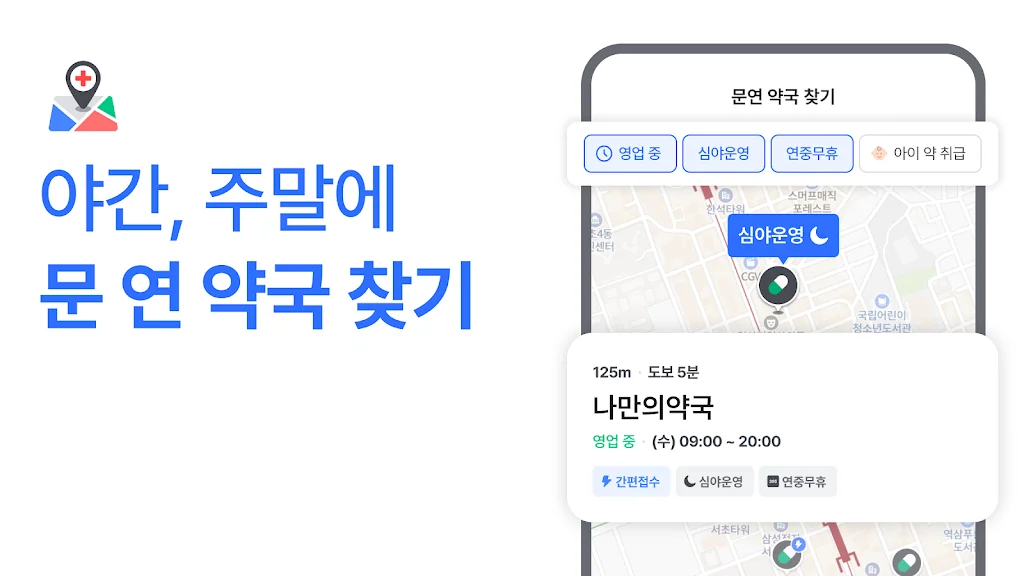 - 야간 약국: 공공 심야 약국, 야간 약국 등 24시간 모두 문 연 약국 찾기를 도와드려요.