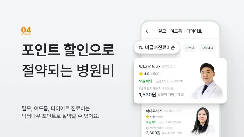 - 닥터포인트로 병원비 아끼기: 돈 버는 만보기로 매일 포인트를 쌓을 수 있고, 언제든 비급여 진료비에 사용해 보세요. 탈모, 다이어트, 여드름, 사후피임 등 다양한 진료 시에 사용할 수 있어요.