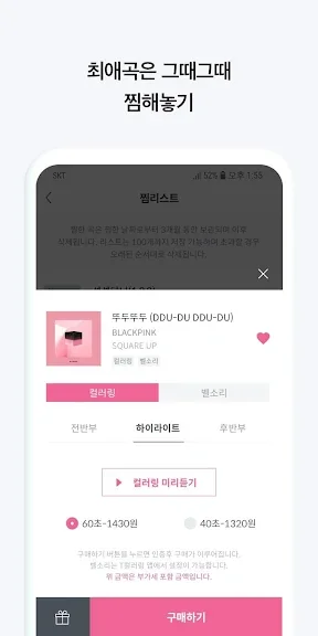 기존의 피처폰 사용자들까지 고려한 기능도 돋보입니다. 기기 변경이나 초기화를 하더라도 저장된 벨소리를 쉽게 다시 다운로드할 수 있고, 부모님이나 피처폰 사용자들에게도 컬러링을 선물할 수 있습니다.