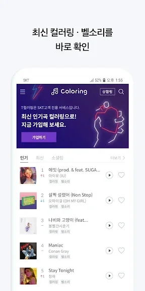 T 컬러링은 이제 SKT 고객뿐만 아니라 KT 고객도 쉽게 이용할 수 있는 최신 컬러링 및 벨소리 앱입니다. 간단한 인증 과정을 통해 최신 인기곡과 다양한 컬러링을 즐길 수 있습니다. 이제 친구에게 마음에 드는 컬러링이나 벨소리를 자유롭게 선물할 수 있는 기능도 추가되어, 보다 즐거운 음악 공유 경험을 제공합니다.