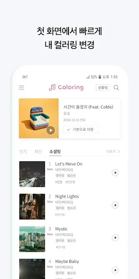 T 컬러링의 메인 화면에서 자신이 설정한 컬러링을 간편하게 확인하고 변경할 수 있으며, 연령대별 추천 음악과 실시간 인기 검색어를 통해 현재 유행하는 트렌드를 쉽게 파악할 수 있습니다. 찜하기 기능을 통해 최대 100곡까지 마음에 드는 곡을 저장해 두고, 나중에 간편하게 사용할 수 있습니다.