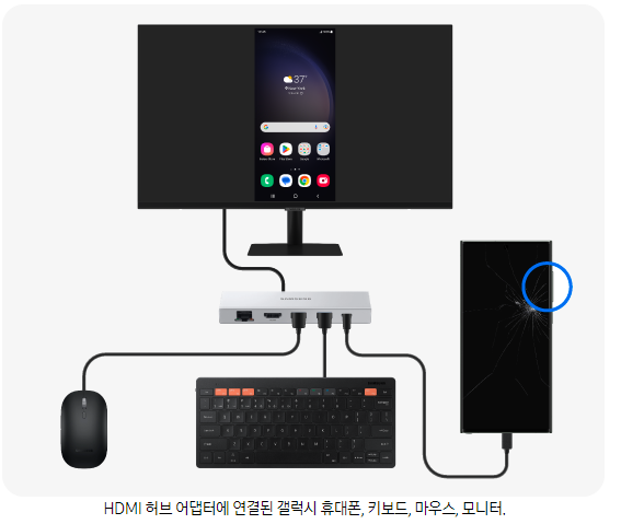 액정이 깨져 터치가 불가능한 경우, 스크린 미러링 기능을 통해 화면을 TV나 모니터에 출력할 수 있습니다. 스크린 미러링을 통해 스마트폰 화면을 외부 모니터에 그대로 띄울 수 있으며, 이를 통해 스마트폰을 조작하거나 데이터를 백업할 수 있습니다. HDMI 케이블을 스마트폰과 모니터의 HDMI 단자에 연결하고, USB 마우스와 키보드도 함께 연결해 조작할 수 있도록 세팅하면 됩니다. 이때, 음량(상), 음량(하) 버튼을 동시에 눌러 HDMI 허브 어댑터에 스마트폰을 연결하면 화면이 모니터에 표시됩니다.