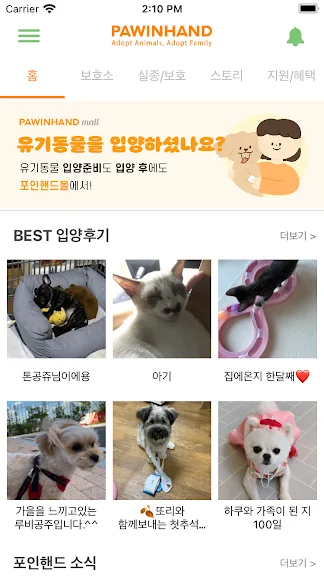포인핸드는 유기동물에 대한 관심을 높이고, 사람들이 입양을 통해 동물들에게 새로운 기회를 제공할 수 있도록 도와줍니다. 입양 후기는 물론, 임시보호와 입양홍보도 지원해 다양한 사람들과 정보를 나눌 수 있는 커뮤니티 기능도 제공합니다.