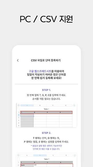 • Excel, 구글 시트에서 단어장을 만들어 CSV 형태로 앱에 손쉽게 추가할 수 있어요.