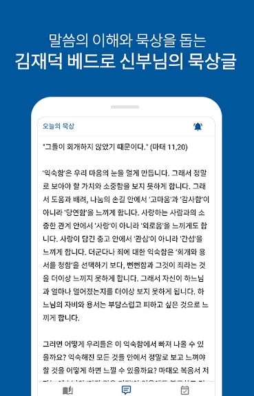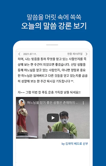 앱을 실행하면 그날의 미사 말씀을 확인할 수 있으며, 중요한 단어나 구절에 대한 해설을 제공해 말씀을 더욱 깊이 이해하는 데 도움을 줍니다. 또한, 신부님의 강론 말씀과 영상을 통해 신앙의 의미를 되새기고, 일상 속에서 말씀을 실천하는 힘을 얻을 수 있습니다.
