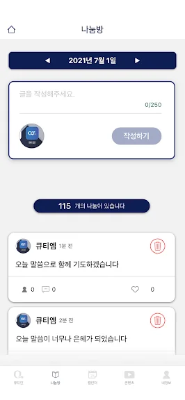 그날 본문으로 묵상하고 깨달은 것을 APP 구독자와 함께 나눌 수 있습니다. 큐티인 APP 안의 작은 커뮤니티 공간으로서, 간단한 묵상과 기도 제목, 적용하기 등을 나눌 수 있으며, 댓글과 좋아요 표시를 남길 수 잇습니다.