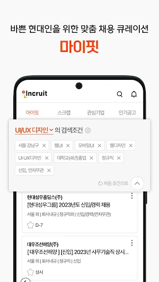 - 공고는 많은데 하나하나 찾아보기 힘들다면? 나에게 가장 잘 맞는 회사와 직무의 채용 정보들을 인크루트가 쏙쏙 골라드릴게요!