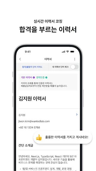 - 이력서 작성 시 AI의 코칭을 받을 수 있습니다 (서류 합격률 30% UP)