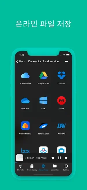 iCloud Drive, Google Drive, Dropbox, OneDrive, Box, MEGA, Cloud Mail.ru, 百度网盘, InfiniCLOUD, Yandex.Disk, WD MyCloud Home, Put.io, MediaFire, MyDrive, pCloud, HiDrive, OpenDrive 등 다양한 클라우드 서비스에서 쉽게 음악에 접근할 수 있습니다.