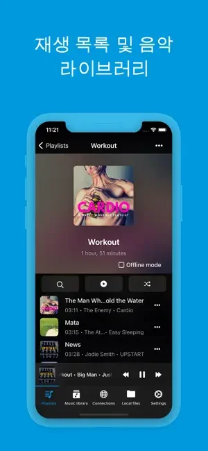 좋아하는 곡, 앨범, 아티스트를 오프라인으로 다운로드하여 들을 수 있습니다. 오디오 플레이어 캐시를 활성화하여 최근에 재생한 곡을 자동으로 다운로드할 수도 있습니다.
