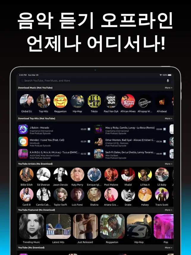 3천만 개 이상의 MP3 음악을 빠르게 다운로드하고, 이퀄라이저, 가사, 베이스 부스트, 테마와 함께 언제든지 오프라인 음악을 감상하세요. 화면이 꺼져 있어도 오프라인 음악 및 비디오, 팟캐스트, FM 라디오를 들을 수 있습니다.
