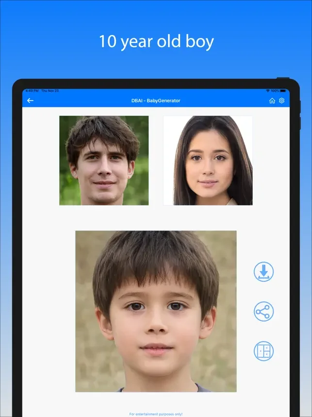 당신의 미래의 아기가 어떻게 생겼는지 궁금하신 적 있나요? 그렇다면 지금 이 앱을 사용해 보세요! 저희 앱은 인공지능 기술을 사용하여 당신과 파트너의 얼굴 특징을 분석하고 미래의 아기 얼굴을 예측할 수 있습니다. 사진을 쉽게 업로드하고 파트너의 사진과 합친 후, 아기의 성별을 선택하고 미래의 아기를 생성해 보세요. 저희 베이비 메이커 앱은 정확한 결과를 제공합니다. 가족이 어떻게 생길지 상상하는 재미있는 방법입니다!