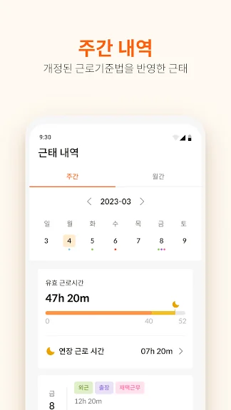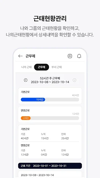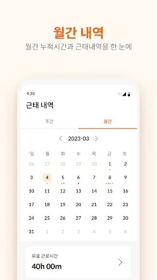 - 주간/월간 누적 근태 내역을 볼 수 있습니다.