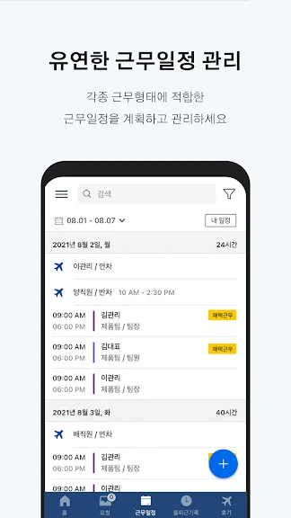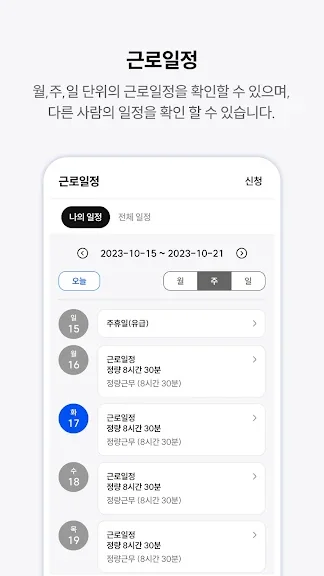 근무일정과 휴가일정은 실시간으로 동기화가 이루어져, 관리자와 근로자는 항상 최신 버전의 스케줄을 조회할 수 있습니다.