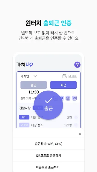 - 별도의 보고 없이 근로자 앱에서 터치 한 번으로 간단하게 출퇴근을 인증해요.