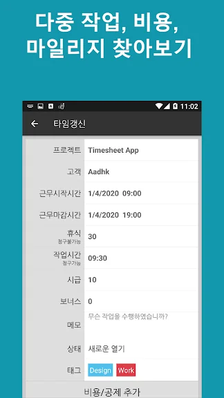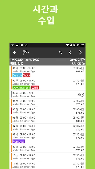 아래는 타임시트 - 타임카드 - 근무시간 - 근무일지 어플에 대한 스크린샷 정보입니다.