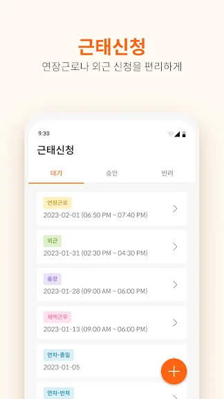 - 연장근로, 출장, 재택근무, 휴가 신청을 할 수 있습니다.