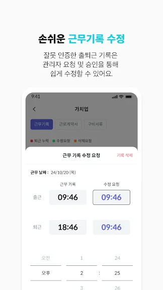 - 잘못 인증한 출퇴근 기록은 관리자 요청 및 승인을 통해 쉽게 수정 가능해요.