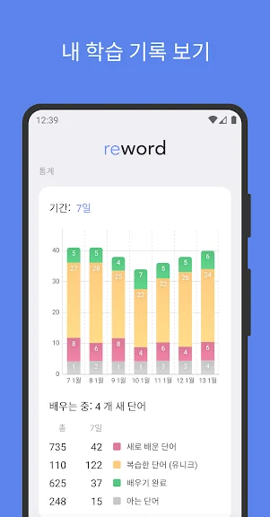 • 공부 통계: 이 기능을 통해서 일주일 전, 한 달전, 3 개월 전 그리고 1 년전 외운 단어를 추적할 수 있어요.