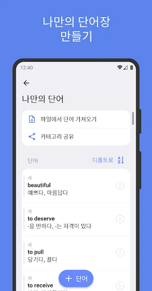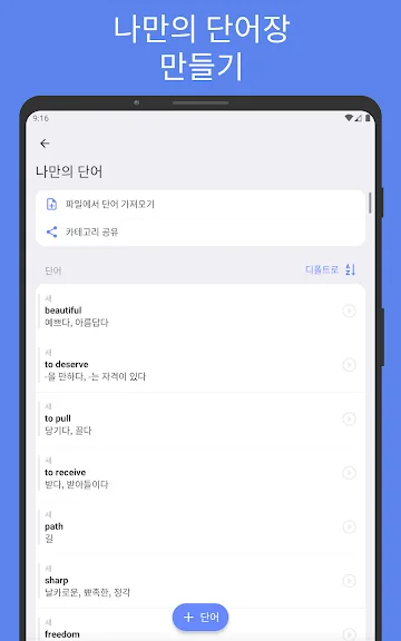 • 자신만의 플래시카드를 추가하고 쉽게 단어를 외우세요. 번역, 발음기호, 사진 그리고 예문 등이 자동으로 채워져요.