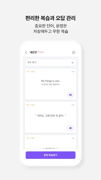 - 문장, 단어 저장: 외우고 싶은 문장과 단어를 저장하고 반복 복습 가능