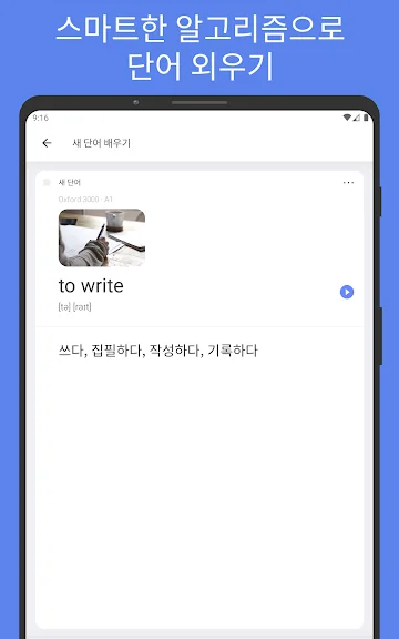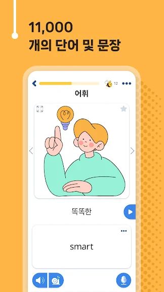 • 단어의 예문과 스마트한 알고리듬이 가장 효과적으로 우리의 영어를 지도해 줄 거예요. 그래서 여러분은 빠르게 단어를 외우고 오래동안 기억할 거예요.