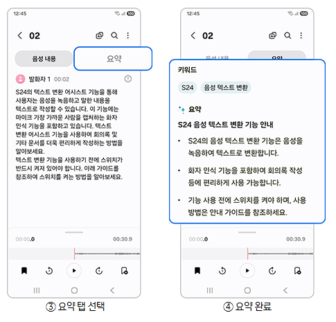2단계) 요약 탭을 눌러 음성 내용의 텍스트 요약 결과를 확인하세요.