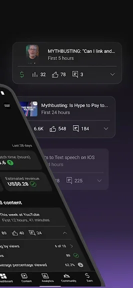 - 상세한 분석을 통해 내 채널과 다양한 콘텐츠 유형의 실적을 파악합니다. 또한 분석 탭에서 다양한 콘텐츠 유형의 실적 데이터를 확인할 수 있습니다.