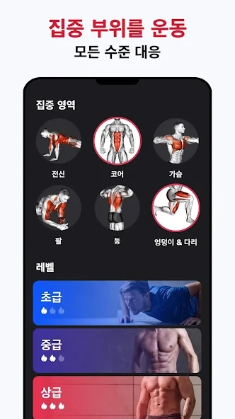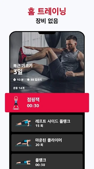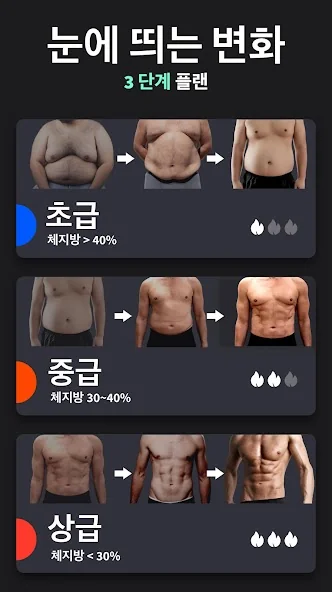초보자 및 프로 모두를 위한 3 단계의 난이도가 있습니다. 전문 피트니스 코치가 디자인한 이 앱은 남성의 문제 부위, 배, 가슴을 집중 공격해 빠른 체중 감량 및 복근 만들기를 도와줍니다. 매일 다른 운동으로 쉽게 따라할 수 있습니다.