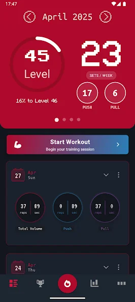 PlayThenics는 무게 운동과 맨몸 운동을 게임처럼 즐길 수 있는 몰입형 레벨 시스템, 업적, 진행 추적으로 매 순간 동기 부여를 제공합니다.