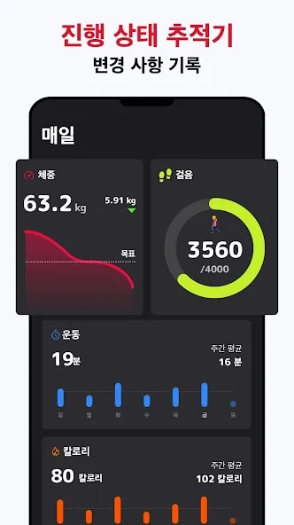 비만이거나 관절에 문제가 있는 사람들을 위한 충격이 적은 옵션 제공. 헬스장도 필요 없고, 장비도 필요 없습니다. 자신의 체중을 사용해 지방을 빼고 근육을 키우세요. 그래프로 태운 칼로리를 추적하고 체중 감량 진행을 확인할 수 있습니다.