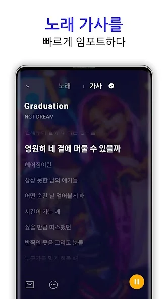 또한, 파일 관리 기능이 잘 되어 있어서 노래, 앨범, 아티스트별로 정리하기 쉽고, 재생 목록도 손쉽게 만들 수 있어요. 가사도 함께 보여줘서, 노래방처럼 따라 부르기 딱 좋아요.