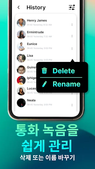 - "삭제" 및 "이름 변경"의 두 가지 기능으로 통화 녹음을 관리 및 정렬