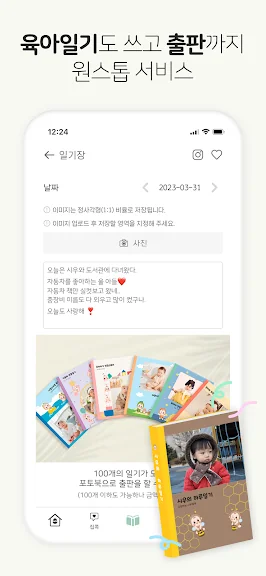6) 육아일기가 100장의 일기가 모이면 귀여운 우아띵프렌즈 캐릭터가 담긴 육아일기장으로 출판도 가능하답니다.